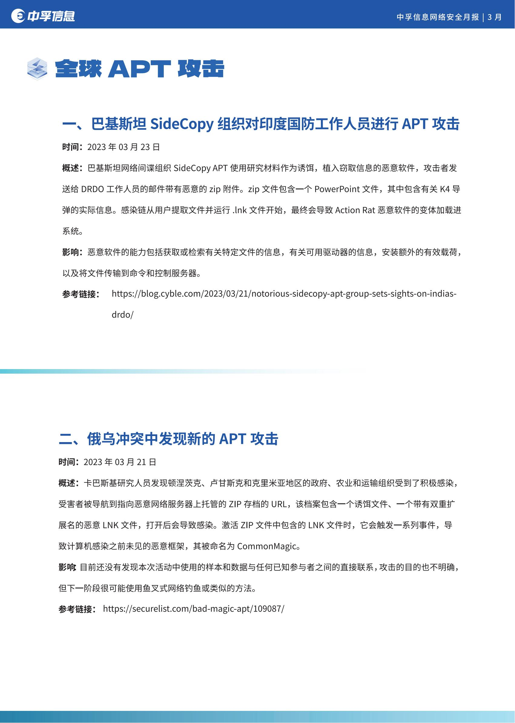 本月共收录全球重大安全事件15个,军事和地缘政治仍是APT组织的首要攻击背景,与之相关的攻击活动非常活跃,分别有:巴基斯坦SideCopy组织对印度国防工作人员进行APT攻击、俄乌冲突中发现新的APT攻击。