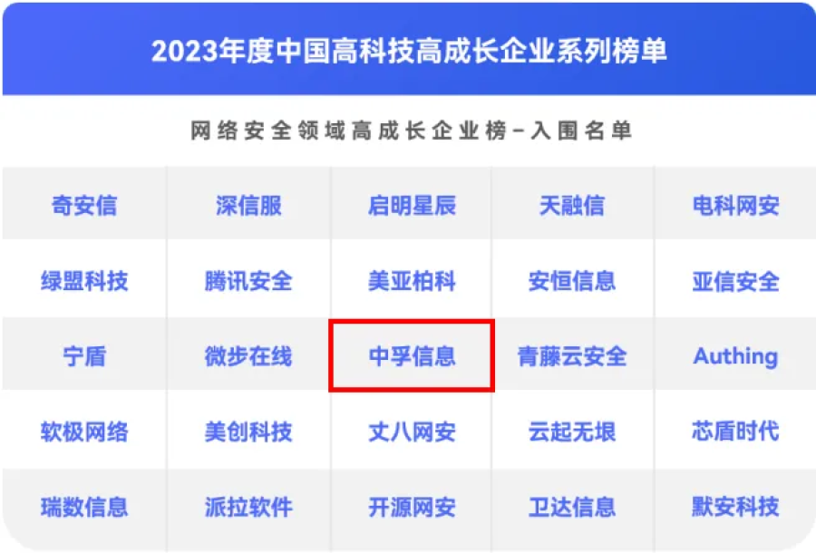 近日,第一新声&天眼查联合发布了2023年度中国高科技高成长企业系列榜单,中孚信息凭借先进的技术创新能力和专业的服务能力,再次获得评审组专家的高度认可,荣登「网络安全领域高成长企业榜」榜单。